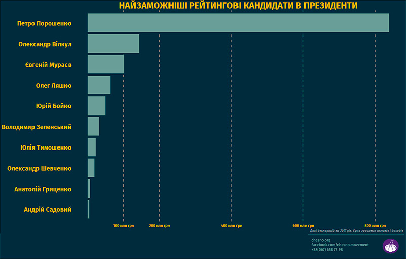 Найбагатшим виявився діючий глава держави Петро Порошенко, у нього (ОФІЦІЙНО) всього лише – 839 млн. грн. Наступний у цьому списку – Вілкул. Найменш заможні: Садовий та Гриценко.
