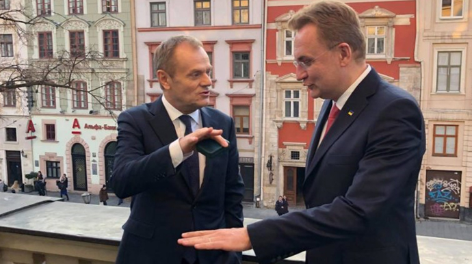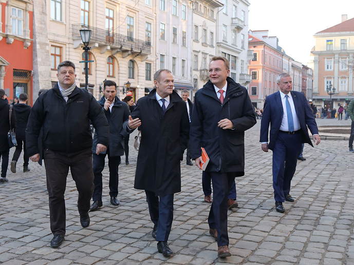 Дональд Туск залишив допис в книзі почесних гостей Львова, а також прогулявся містом в супроводі Андрія Садового.