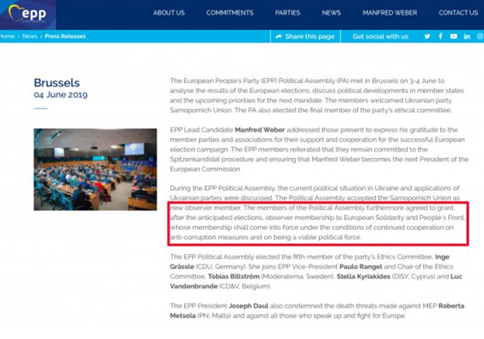 Але це неправда. В новині на сайті ЄНП сказано дослівно: "Члени Політичної Асамблеї погодилися надати після очікуваних виборів членство Європейській Солідарності і Народному Фронту, яке набуде чинності за умов співпраці з антикорупційних заходів і життєздатності політичної партії".