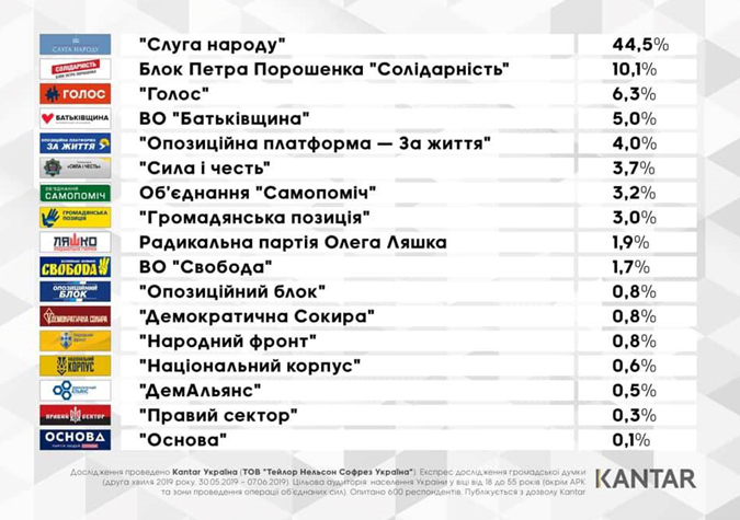 Одразу за ними – «Сила і Честь» Ігоря Смешка та «Самопоміч» Андрія Садового. Найвищий рейтинг у партії президента – 44,5%. Разом з нею до парламенту проходять Блок Петра Порошенка (Європейська солідарність), «Голос» та «Батьківщина».
