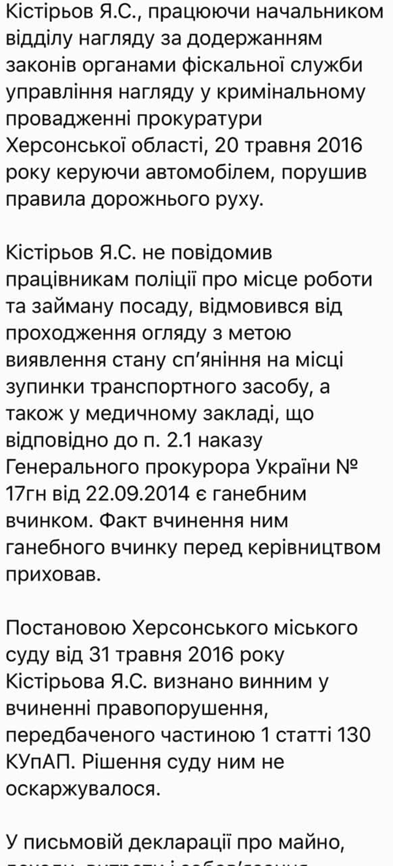 У адміністративному правопорушенні, передбаченому частиною першою статті 130 Кодексу України про адміністративні правопорушення. Людською мовою: 20 травня 2016 року інспектор батальйону УПП м. Херсона рядовий поліції Х. зупинив водія автомобіля «Ніссан Мурано» з явними ознаками алкогольного оп'яніння, про що й було складено протокол. У Єдиному реєстрі судових рішень України збереглися дві ухвали судді Херсонського міського суду Херсонської області Ус Олени Володимирівни по справі № 766/3278/16-а н-п 2-а/766/117/16, в якій вона відмовляє Ярославу Кістірьову у задоволенні позову до інспектора батальйону УПП м. Херсона рядового поліції Х. у скасуванні постанови про адміністративне правопорушення. Із матеріалів справи також стало відомо, що затримання та зупинка автомобіля «Ніссан Мурано» під керуванням Ярослава Кістірьова була здійсненна після переслідування автомобілем патрульної поліції й після зупинки водій не представився співробітником прокуратури – просто не міг ворушити язиком.