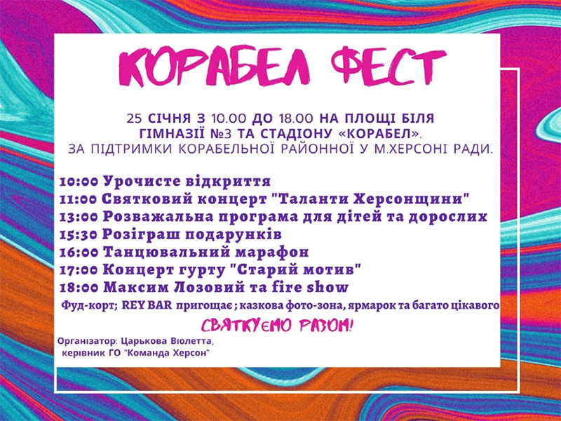 В честь этого общественная организация «Команда Херсон» во главе с Царьковой Виолеттой проводит праздник на протяжении целого дня «Корабел Фест».