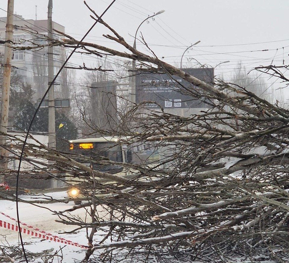 Погіршення погодних умов додало херсонцям чимало проблем. Шквальний вітер повалив дерева, які обірвали електродроти та частково перекрили вулиці. Через снігопад окремі дороги в місті виявилися заметеними.