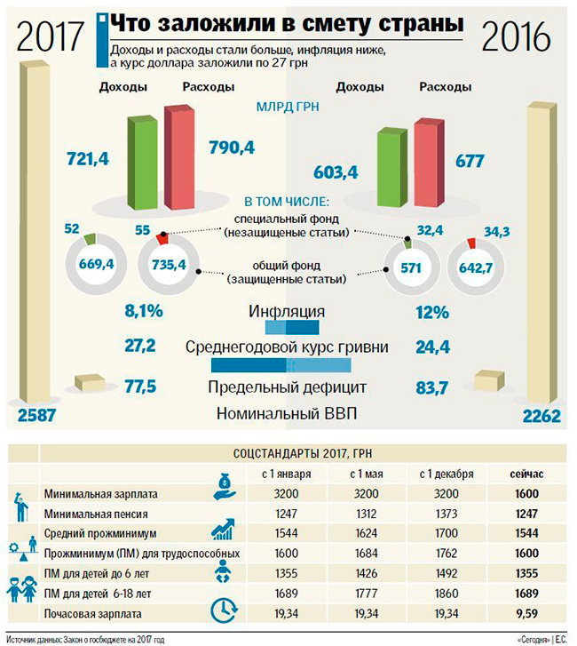 Дохідна частина – 721,4 млрд. грн (у 2016 році – 516,9 млрд.), з них: 17,1 планують отримати від приватизації держпідприємств; 190,8 млрд. – позичити.
