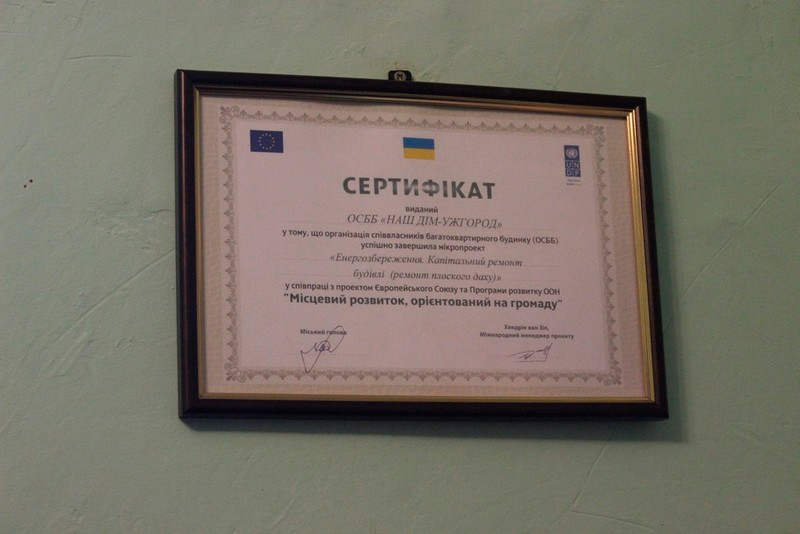 А тому після утворення ОСББ першою нагальною проблемою, яку треба було вирішити негайно став саме дах. Але, де взяти гроші? Проблема – є, грошей на її вирішення – немає. Саме тоді молодий та амбітний Микола Щерба дізнався, що ще у 2015 було започатковано трирічну програму Європейського Союзу ПРОООН, яка «роздавала» гроші на ремонт. Правління ОСББ підготувало відповідні документи на отримання гранту і подало їх в Ужгородську міську раду. Програма «Місцевий розвиток, орієнтований на громаду-3» будувалася за принципом – солідарного фінансування проектів. Європейський Союз давав 50% від потреби, 45% давала міська влада з місцевого бюджету, а ще 5% знаходили самі мешканці ОСББ.