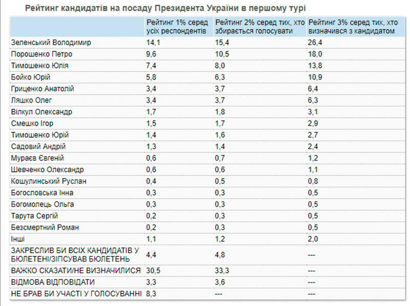 Володимир Зеленський – 26,4% (серед тих збирається голосувати і визначився з кандидатом); Петро Порошенко – 18%; Юлія Тимошенко – 13,8%; Юрій Бойко – 10,9%; Анатолій Гриценко – 6,4%; Олег Ляшко – 6,3%.