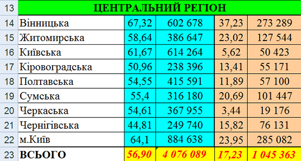 У Центральному регіоні (Вінницька, Житомирська, Київська, Кіровоградська, Полтавська, Сумська, Чернігівська, Черкаська області та місто Київ) – 56,90 (6 961 789 голосів).