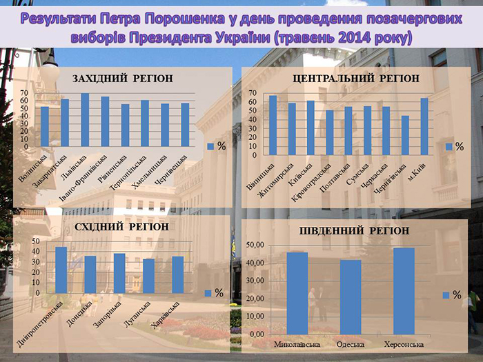 Захід віддав Порошенко майже 60% своїх голосів. Центр також підтримував Порошенко активно, але трохи менше ніж Захід. Південь віддалився від Заходу вже на 14,33%, тоді, як Схід взагалі поставився до Порошенко стримано, і віддав йому найменшу кількість голосів (на 22,33% від максимуму).