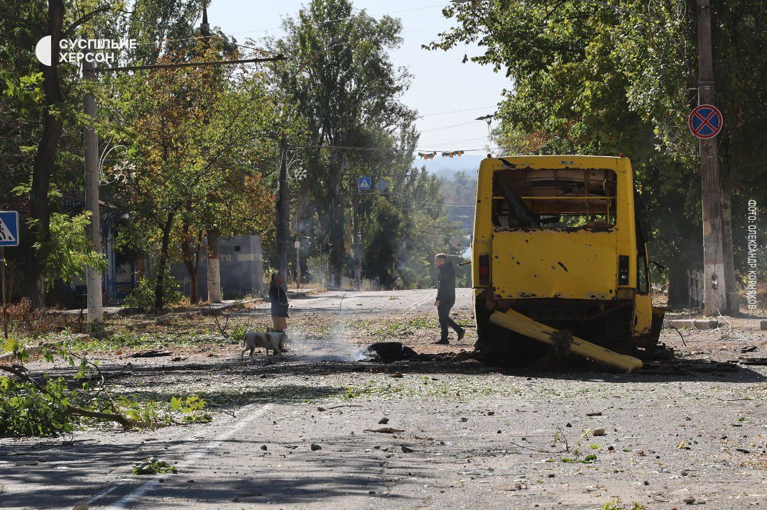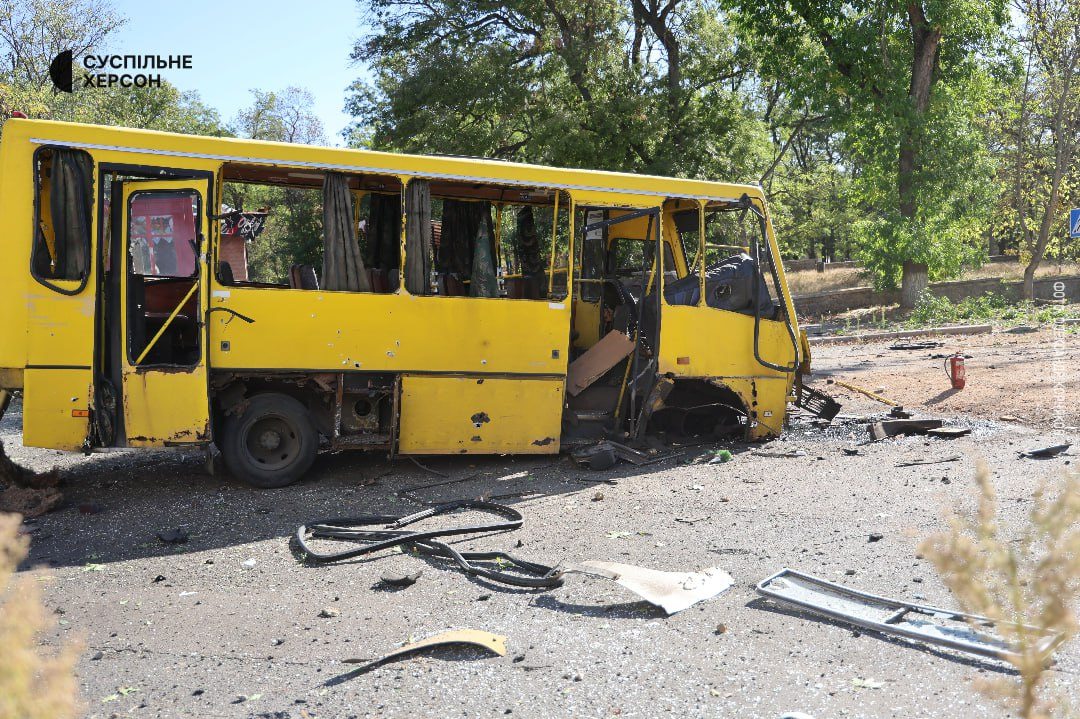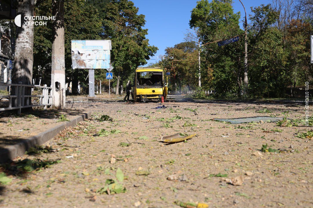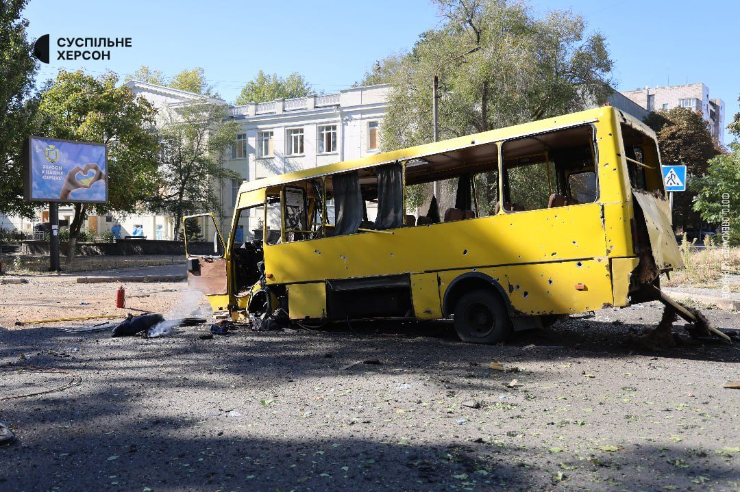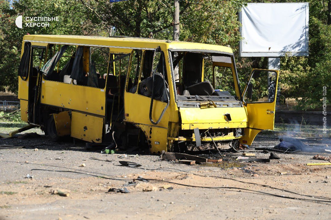 Маршрутне таксі було повністю знищене внаслідок артилерійського обстрілу центру Херсона, який російські війська здійснили сьогодні, 26 вересня, близько 08:30. Один із снарядів влучив саме у транспортний засіб.