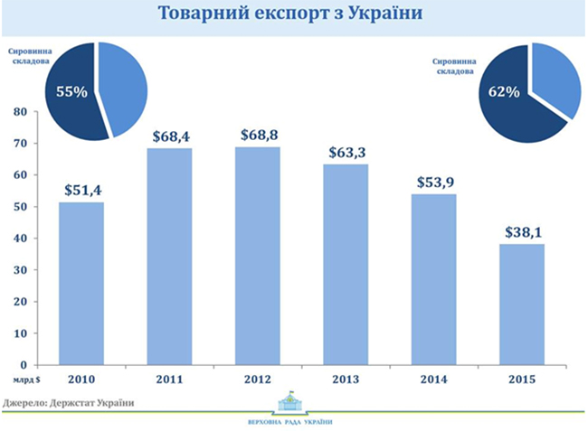 Экспорт украинских товаров в 2015 году обвалился на 30 %. Согласно информации журнала «Митний Брокер» (№3 за 2016 год), в 2015 году экспорт из Украины в страны Евросоюза снизился на 25 % или в денежном выражении на 4 млрд. долларов США.