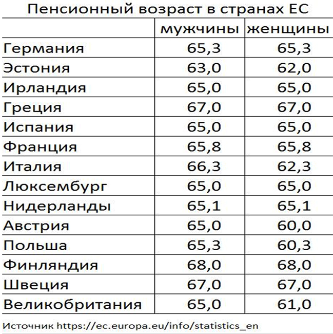 Следует отметить, что в самой Европе также идут процессы повышения пенсионного возраста. Согласно данным Доклада Европейской комиссии «Пенсионные реформы в ЕС» средний возраст выхода на пенсию в странах ЕС к 2040 году для мужчин составит 67 лет, для женщин 66 лет.