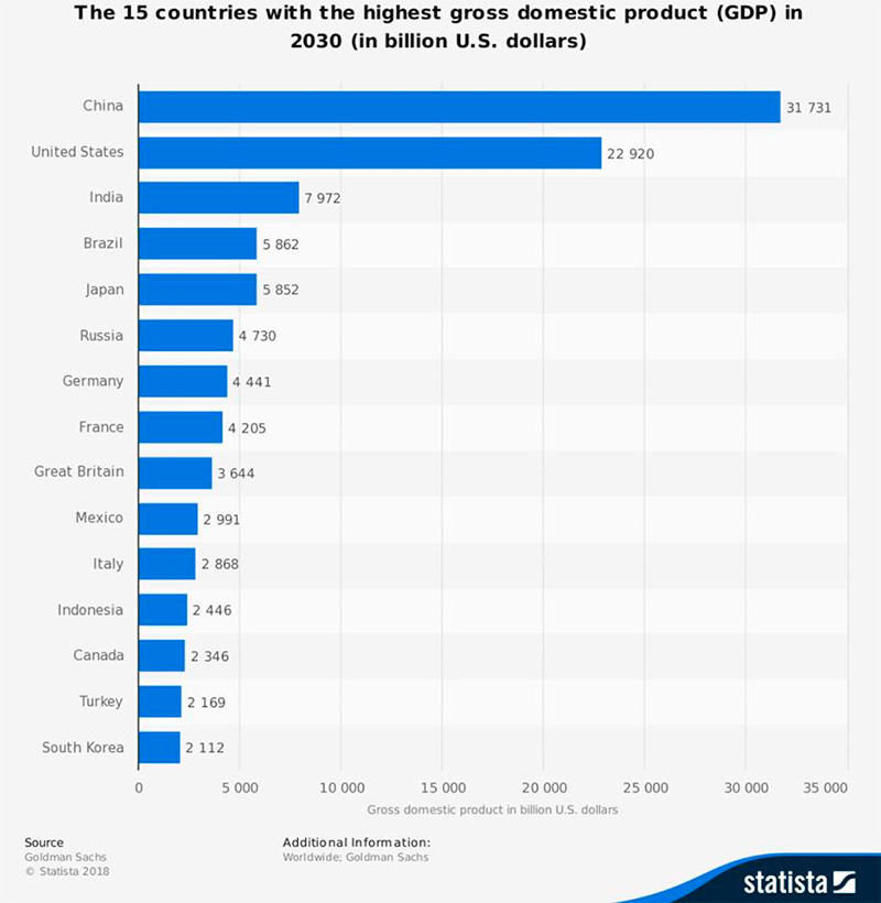 Инвестиционный банк «Го́лдман Сакс» провел исследование экономик разных стран, чтобы определить какие экономики войдут в ТОП 15 стран 2030 года. Согласно прогнозу первое место в мире по объемам валового внутреннего продукта (ВВП) займет Китай. Украина же согласно прогнозу МВФ к 2022 году только достигнет объемов, которые были в 2013 году.