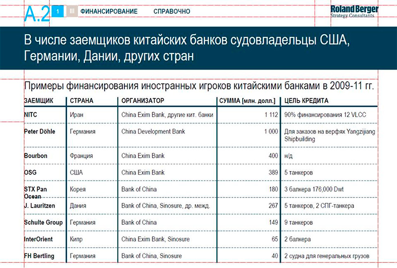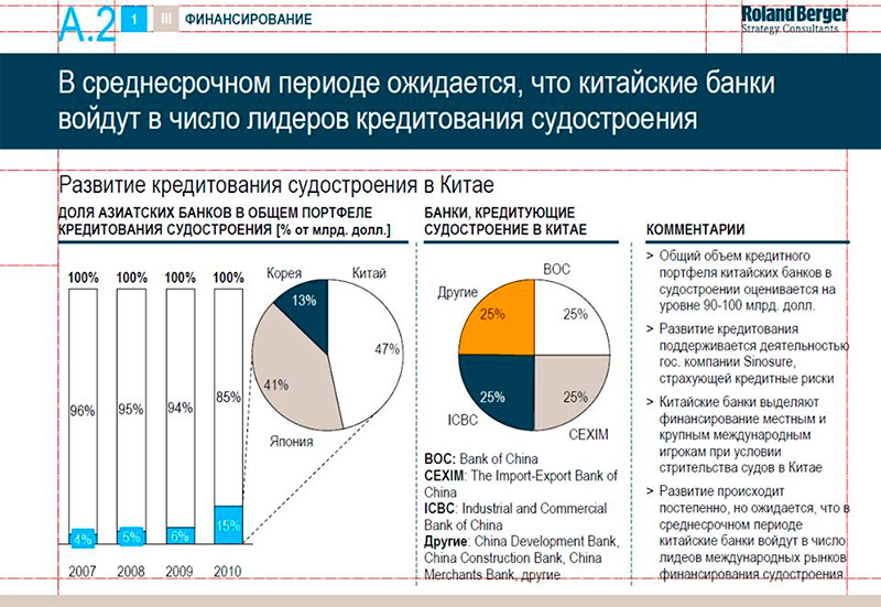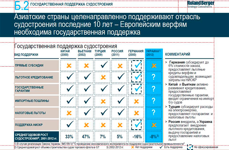 Согласно отчету немецкой консалтинговой компании «Roland Berger» в судостроении правительство Китая активно поддерживает китайские верфи путем предоставления льготных кредитов китайскими банками, выделает государственные деньги на развитие научно-исследовательских работ, предоставляет государственные гарантии и льготы на ввоз оборудования.