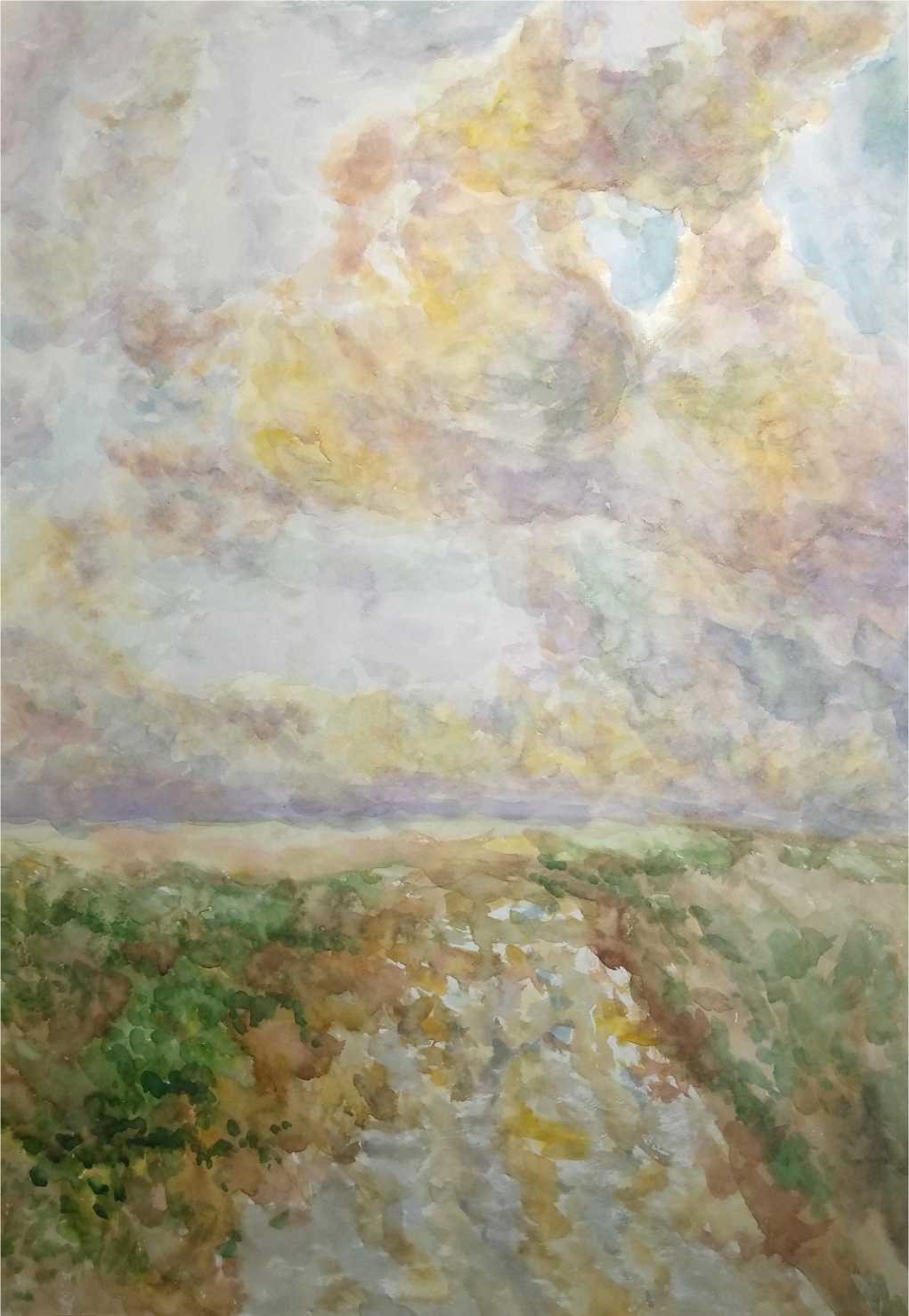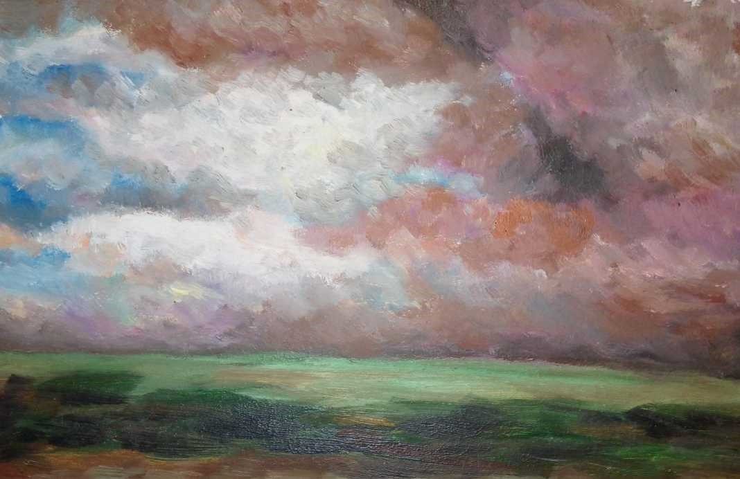 "Безмежне небо Таврії" (Картон, масло 21х32 см)Цей вірш, як і картина були написані в такі близькі і водночас, такі далекі безжурні мирні роки. Тоді небо Херсонщини не спалахувало вибухами та мешканців будили вранці не прильоти ракет, а спів півнів.