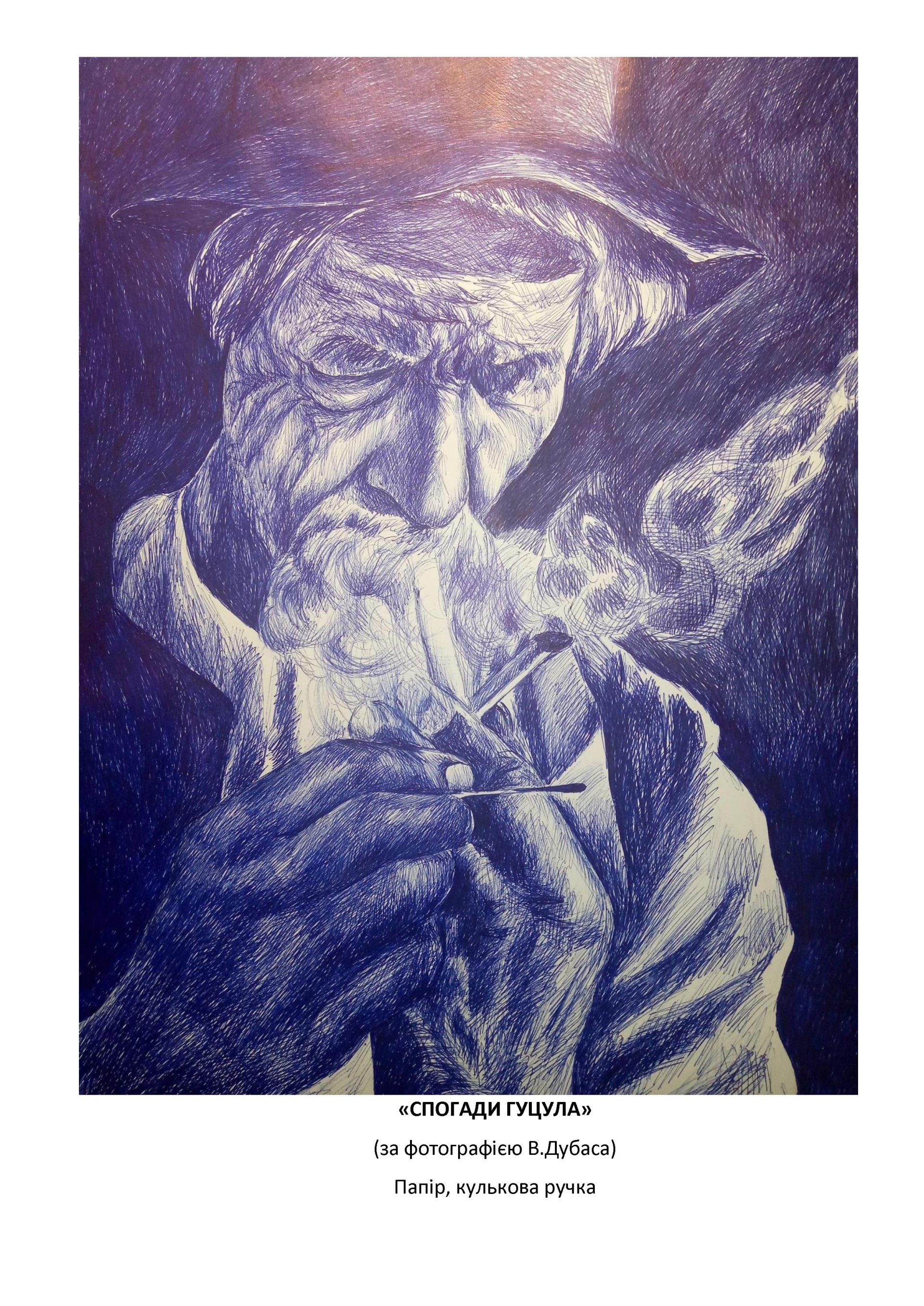 Блукаючи інтернетом у пошуках світлин гуцулів, натрапила на фотографії чудового львівського фотохудожника В. Дубаса. Так виникла ще одна серія гуцулів на основі фотографій В. Дубаса. Його найбільш колоритні фото гуцулів були зроблені, в основному в 70-80-ті роки. Тому, звичайно, якість цих світлин дозволяла працювати у техніці кулькової ручки. В. Дубас - чудовий фотомитець, в його доробку є багато жанрових фотографій, фотографій природи, але найбільш, як на мене, вражаючі були саме світлини гуцулів.