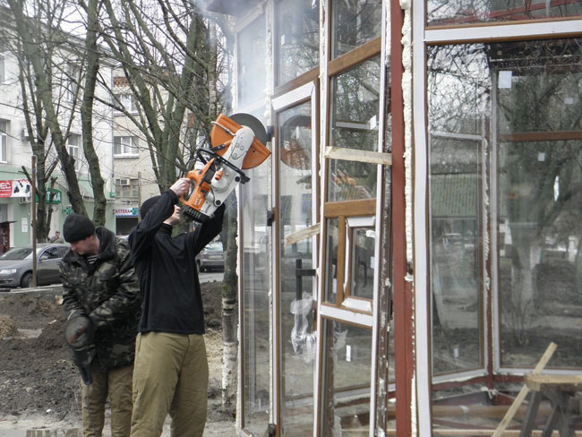 Жильцы выскакивают, бросаются под колёса, происходят потасовки. Приезжают мэр, если близко выборы, либо депутаты, мелкие чиновники. На первый раз атака вроде бы отбита, агрессор отступает, жильцы успокаиваются. Затем всё повторяется по второму, третьему разу. Параллельно по квартирам самых активных «протестувальныкив» методично ходят сотрудники милиции, и ненавязчиво объясняют, чем грозит сопротивление.