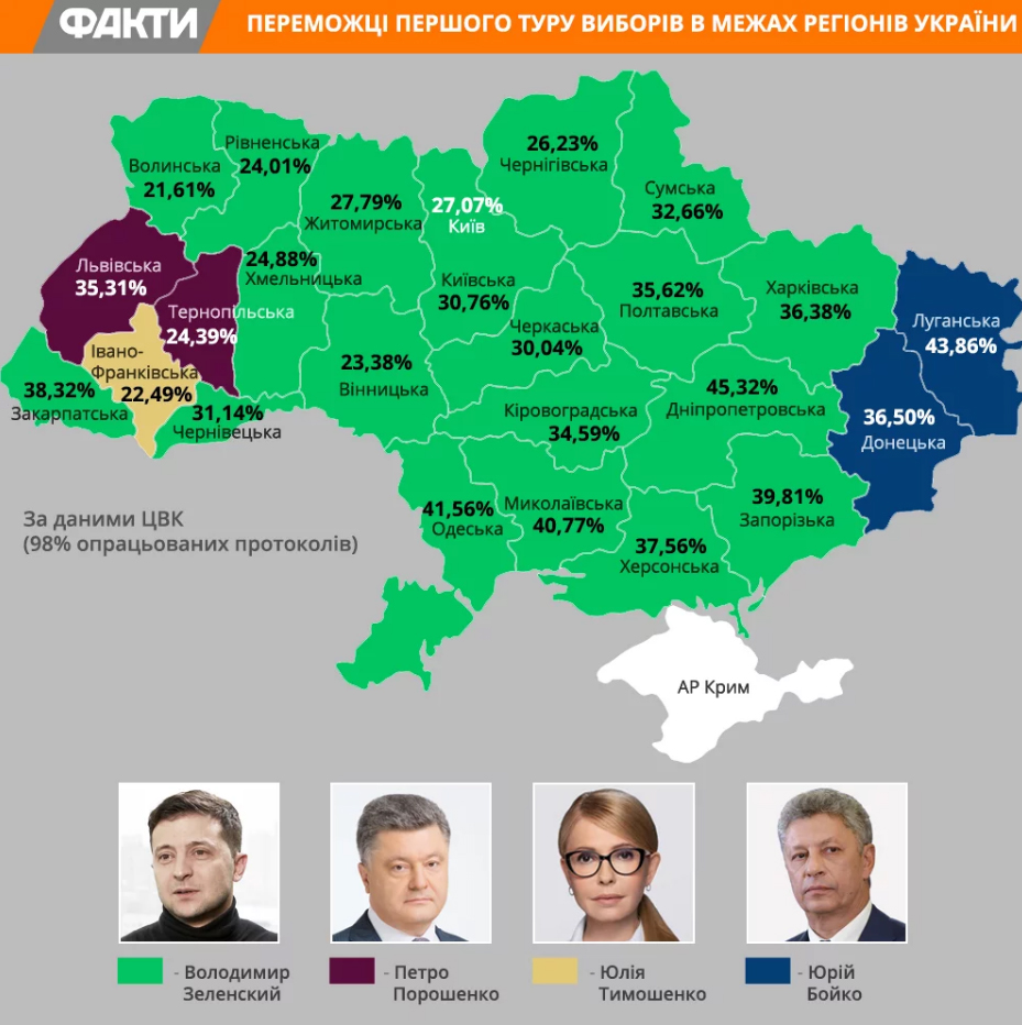 Характерно, что действующего президента, поддерживает всего две из 24 областей — Львовская и Тернопольская. В 20-ти – доминирует Владимир Зеленский. На востоке страны — в Донецкой и Луганской областях — уверенно лидирует Юрий Бойко, И только в Ивано-Франковской области празднует победу Юлия Тимошенко.